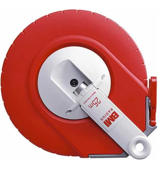 Stahlband weiß lackiert, cm-Teilung, Maßanfang ca. 10 cm nach Anfangbeschlag. Gehäuse aus Polyamid, mit soft-touch-Oberfläche, Kurbelarm (umzubauen von Rechts- auf Linkshändergebrauch) und Parkposition für den Anfangsring.