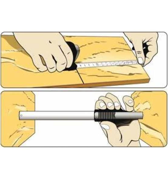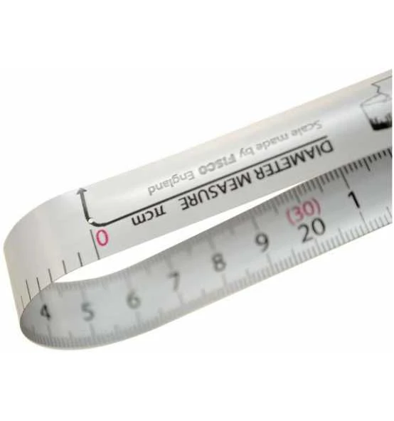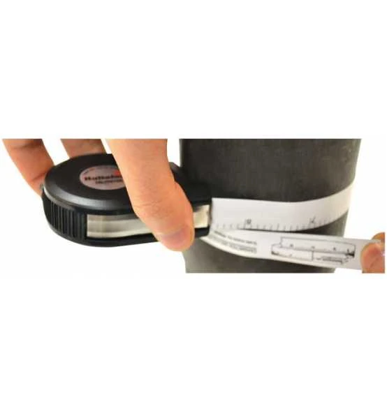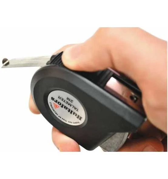 Gehäuse aus schlagfestem Kunststoff, robustes Stahlband. Kombinierte Mess- und Markierkanten. Schwarze mm-Teilung und Spezialskala für die Durchmesserablesung. Maßanfang am Beschlagbeginn. EG-Genauigkeitsklasse II.